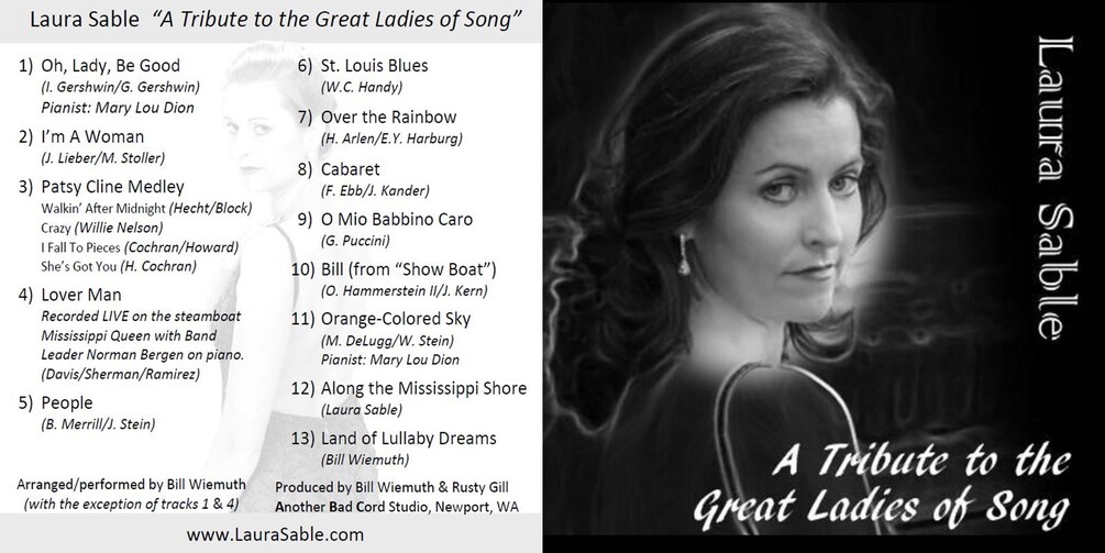 Laura Sable's vocals soar across genres, eras, and styles to deliver a diverse tribute to iconic female singers including Ella Fitzgerald, Patsy Cline, Barbra Streisand, Billie Holliday, Judy Garland, and many more. To hear samples of these wonderful recordings, CLICK HERE.